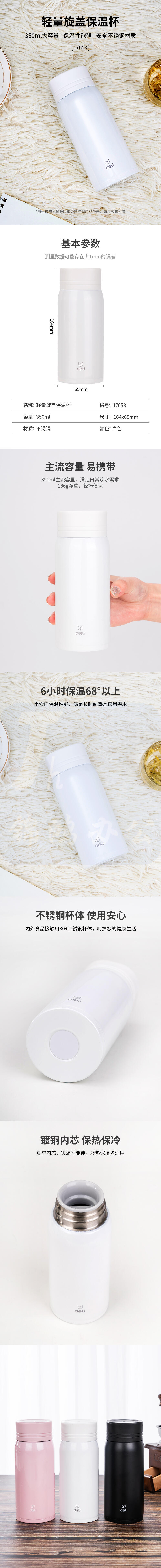 得力350ml 保温杯 商务便携白色304不锈钢保温杯17653