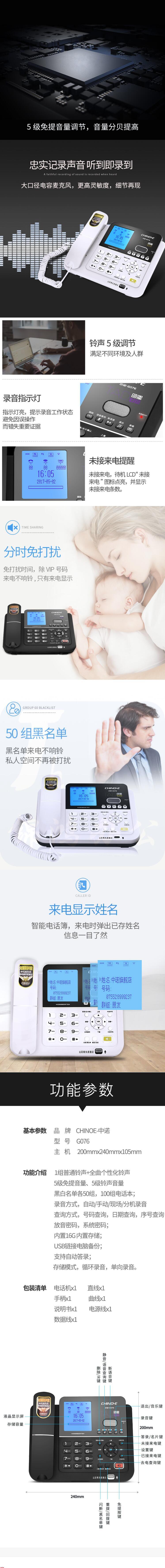 中诺 G076 录音电话机 自动/手动录音 电话机 内置16G卡 连接电脑 雅士黑
