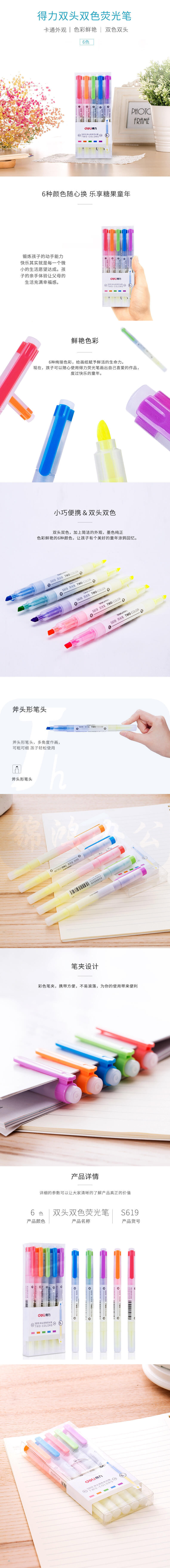 得力(deli)6色双头双色荧光笔重点标记笔 手帐可用水性记号笔5支/盒S619