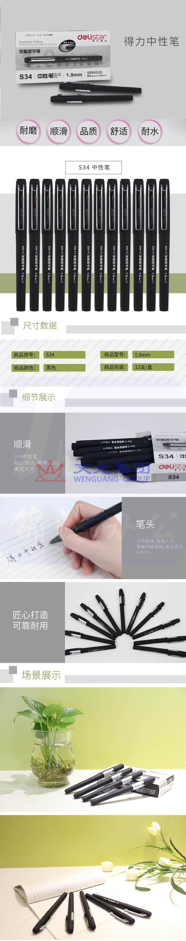 得力 1.0mm加粗中性笔 子弹头拔帽水笔签字笔 黑色12支/盒S34