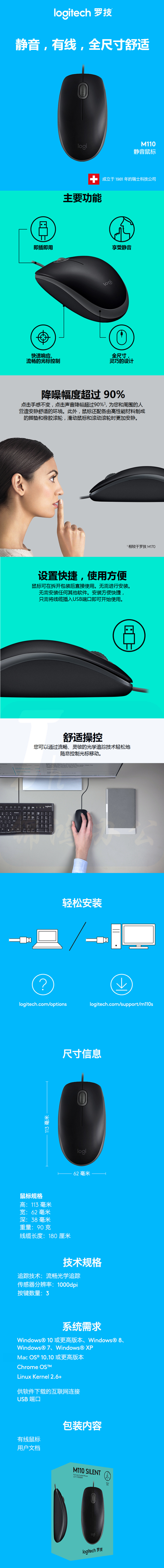 罗技( Logitech) M110 有线静音鼠标 黑色