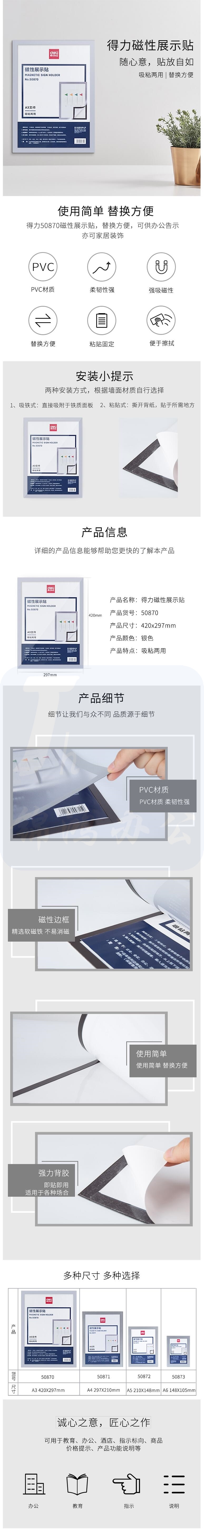 得力 A3 磁性展示贴 50870 执照正本保护套 公告栏通知贴纸 银色