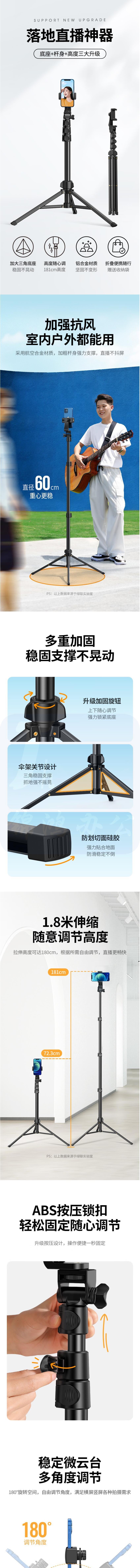 绿联 手机支架落地直播三脚架自拍杆 1.8米【4.7-7.2英寸】90235