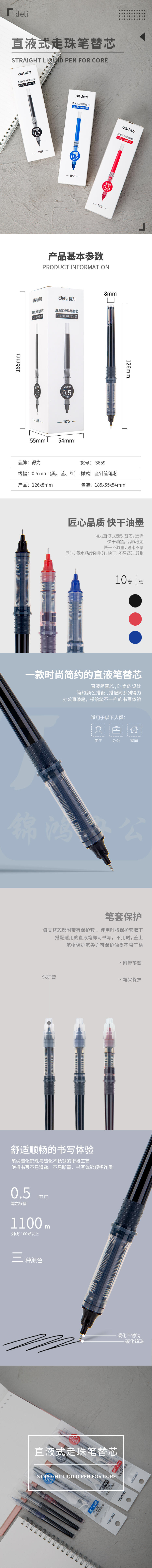 得力(deli) 0.5mm 全针管直液式走珠笔替芯10支装拔帽直液笔替芯DL-S659黑