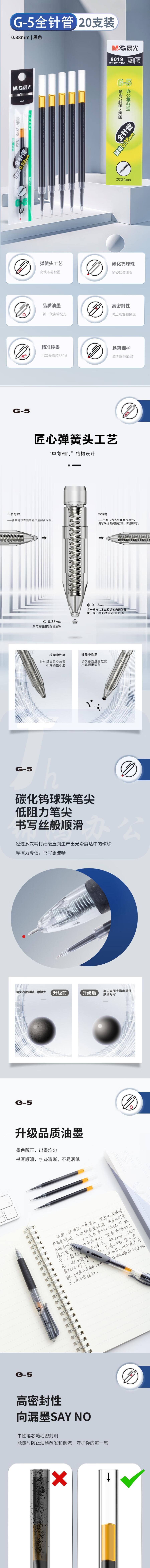 晨光 0.38mm黑色中性笔替芯 经典按动款签字笔替芯 G-5全针管系列水笔芯 20支/盒9019A