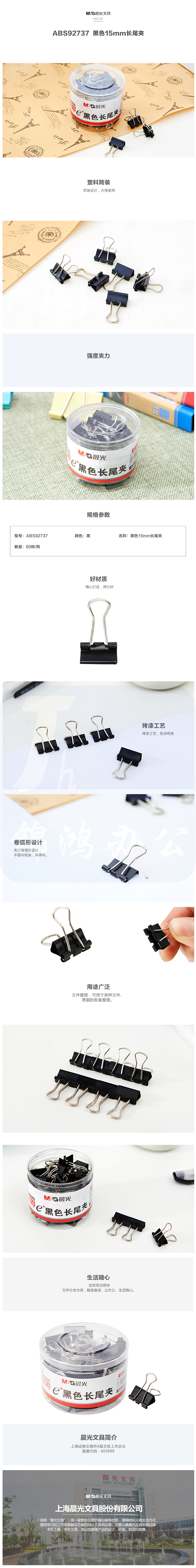 晨光ABS92737黑色长尾夹 15mm 60个/桶