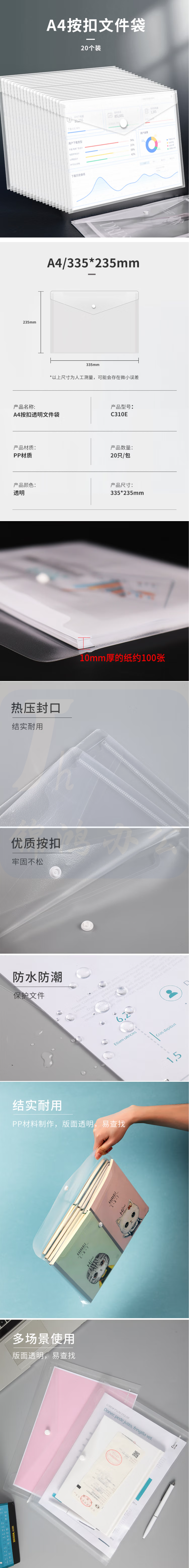 齐心 A4按扣透明文件袋 防水档案袋资料袋C310E 10个装