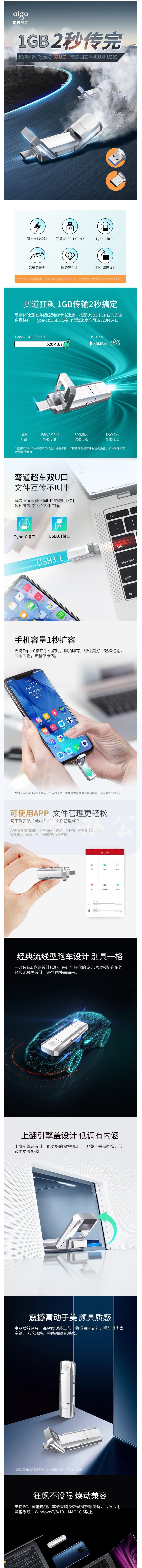 爱国者 128G极速USB3.1 U盘 Type-C双接口高速ssd U393 读520MB
