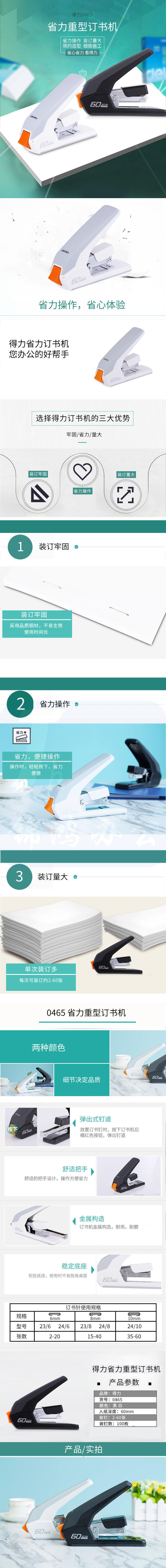得力0465省力订书机(白)最大订60页 适配23/6~23/10订书钉