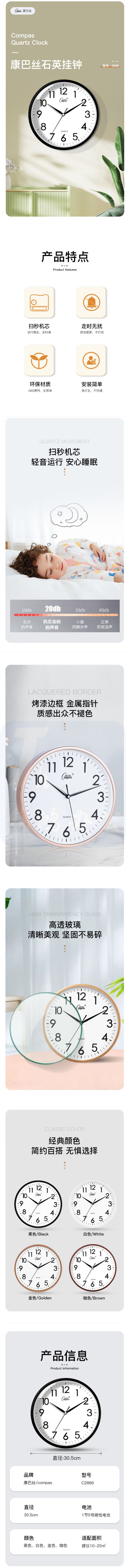康巴丝 挂钟 简约静音客厅石英钟表挂墙时钟 c2866 黑色 直径约30.5cm