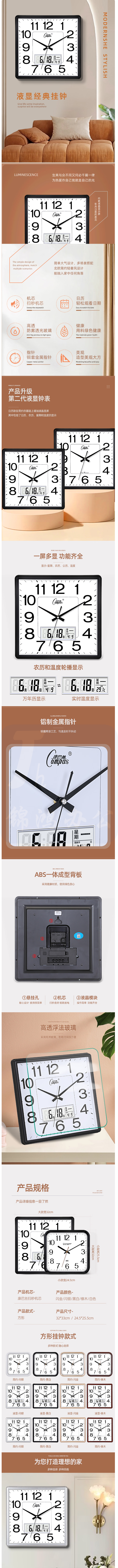 康巴丝 挂钟家用大气方形石英钟办公日历时钟表挂墙卧室壁挂钟表 2548橡木(25*25cm)