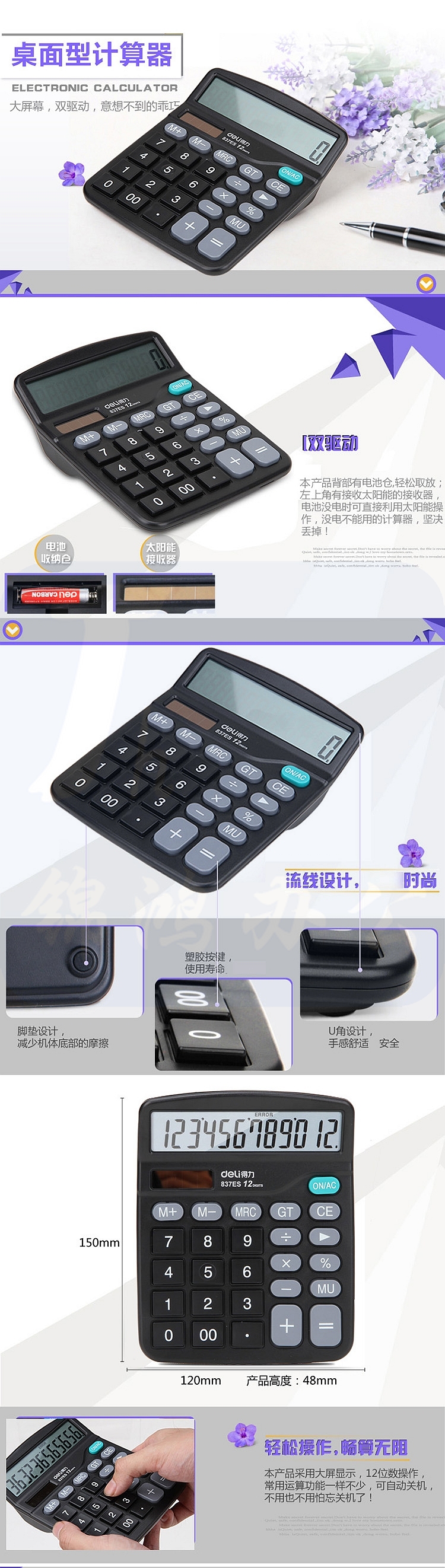 得力 双电源 计算器 12位大屏幕桌面计算机837ES