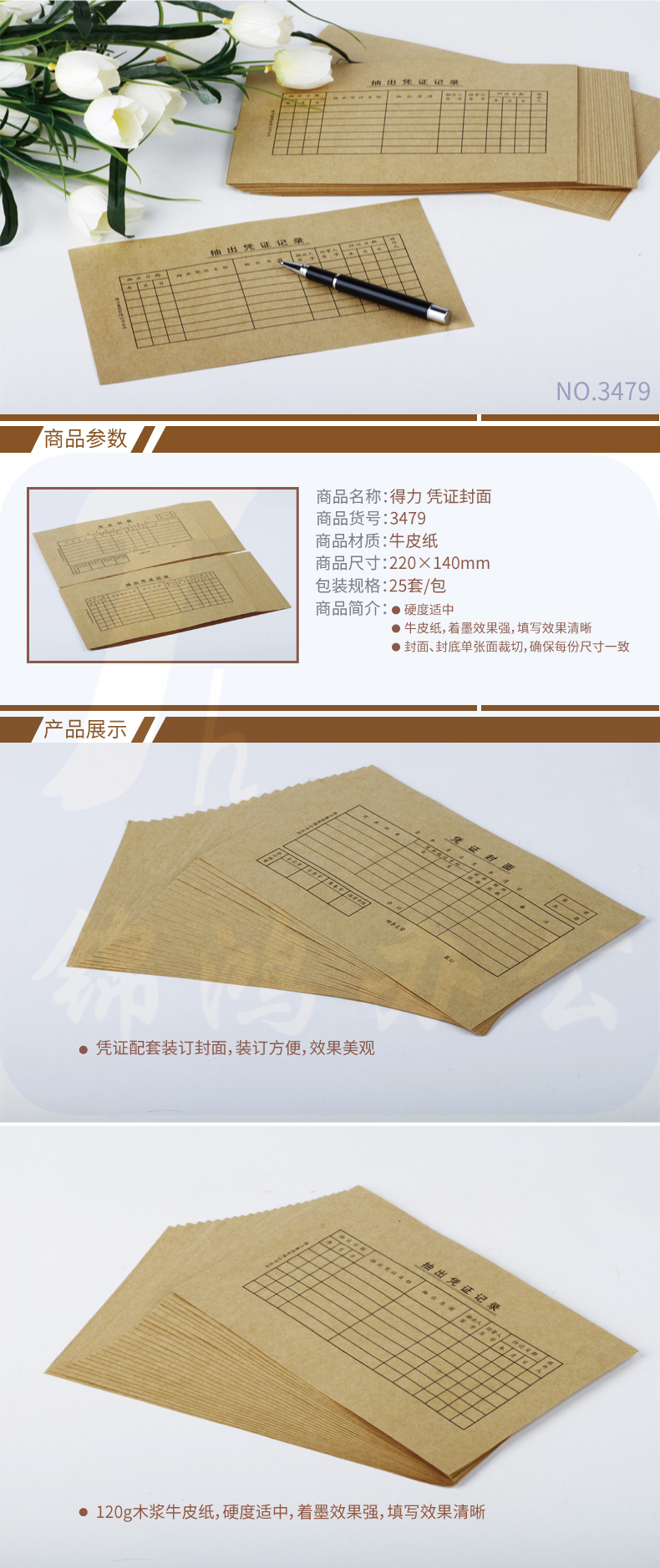 得力(deli)凭证封面 220*140mm 牛皮纸封面 25套/包 3479