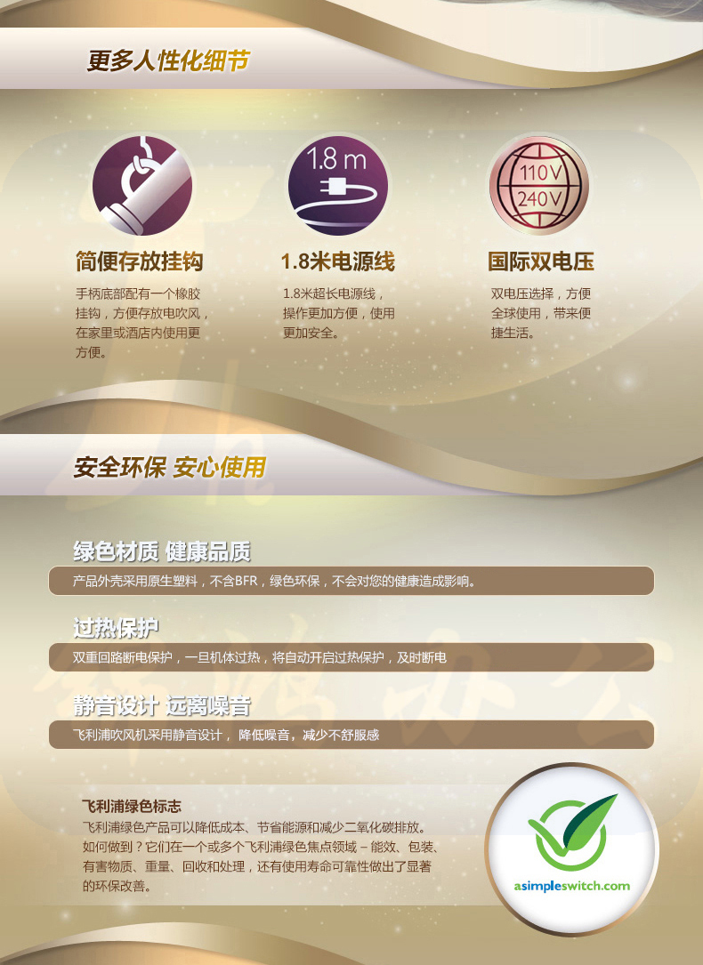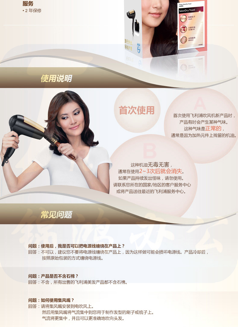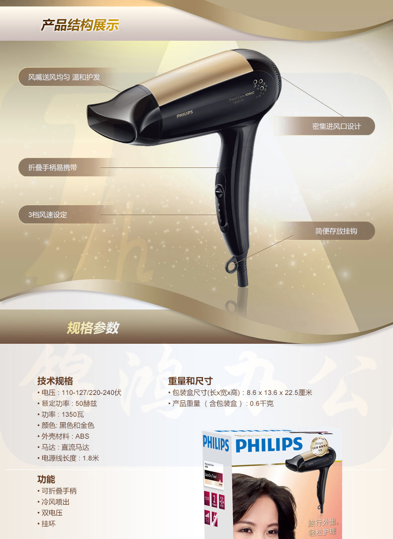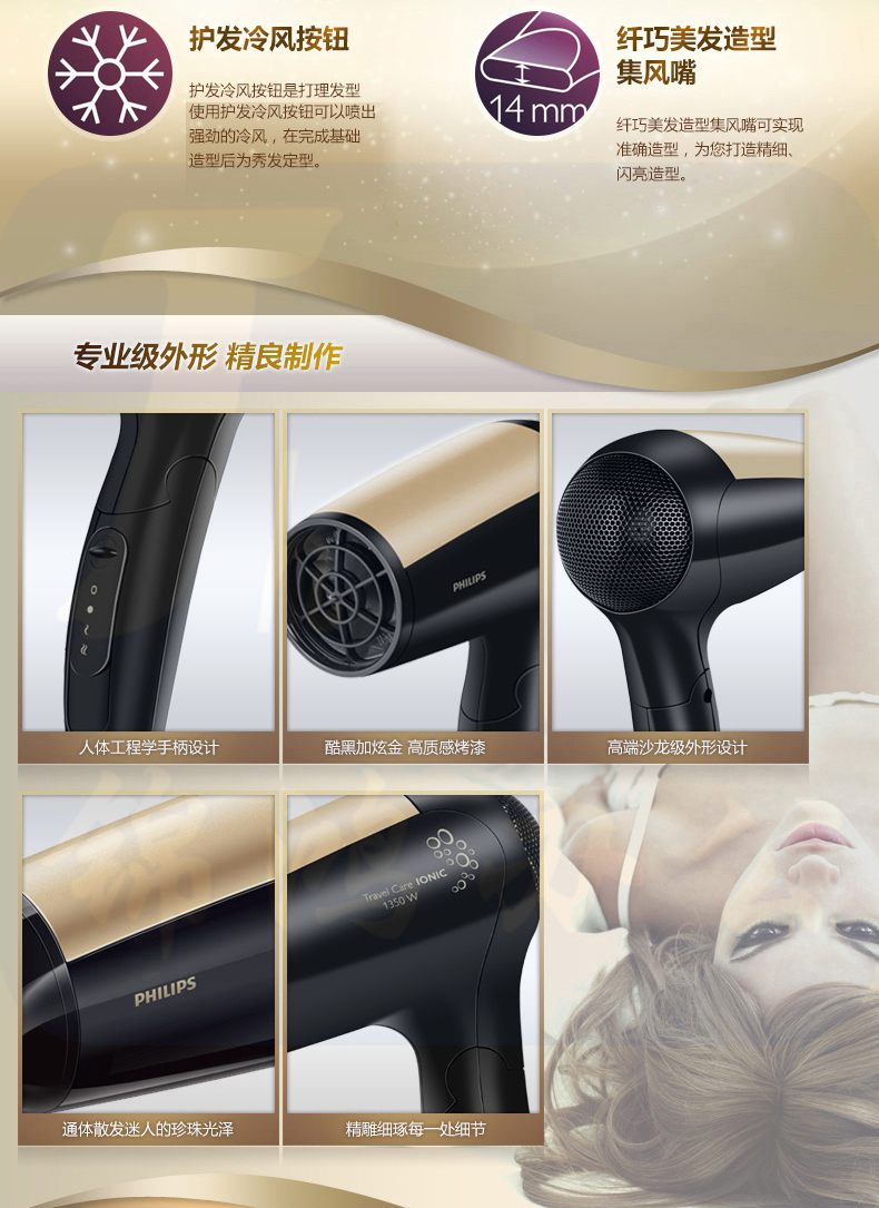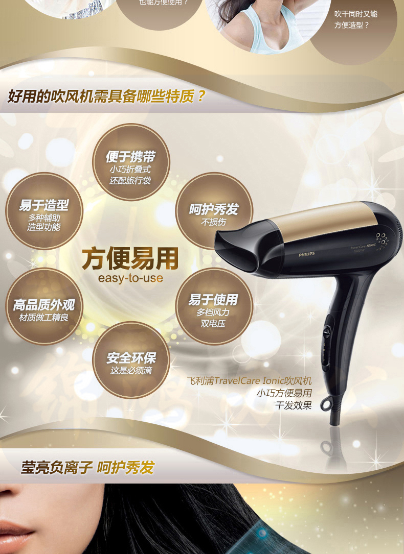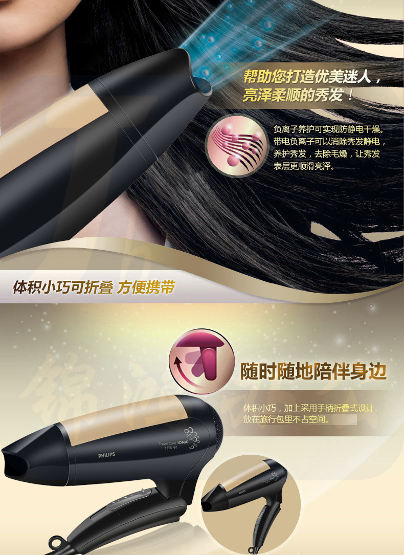 飞利浦(PHILIPS) 电负离子吹风机 冷热风 便携旅行可静音吹风筒