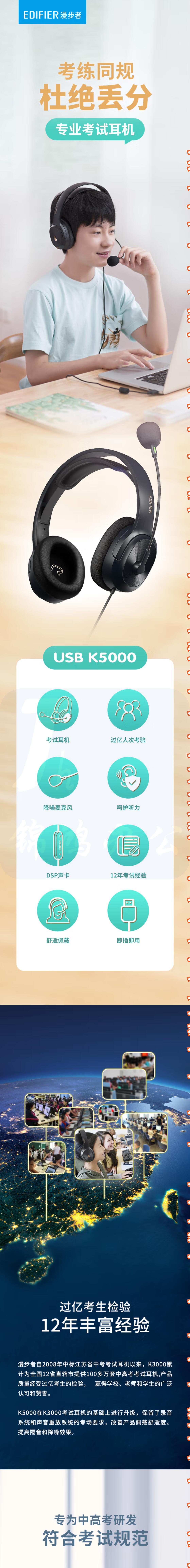 漫步者 USB K5000 专业考试耳机 头戴式电脑耳麦 听力听说口语训练专用耳麦