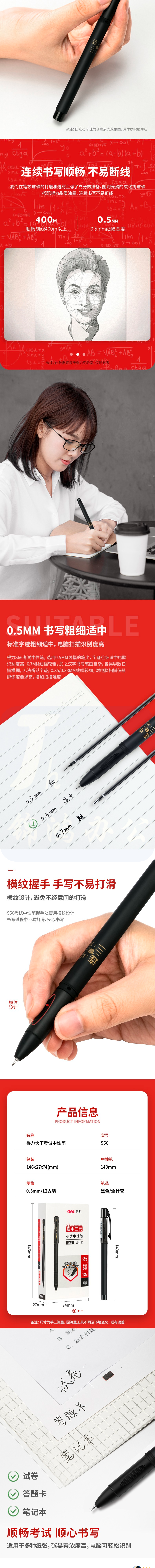 得力S66考试中性笔0.5mm全针管(黑)(12支/盒) 支