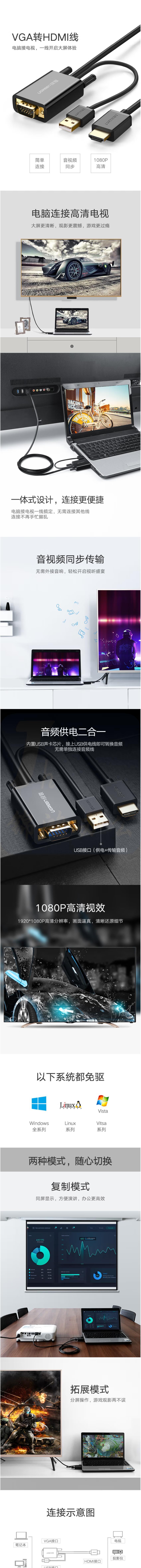 绿联 VGA转HDMI高清转换器线支持音视频同步 2米高清转换器线 MM120/30840
