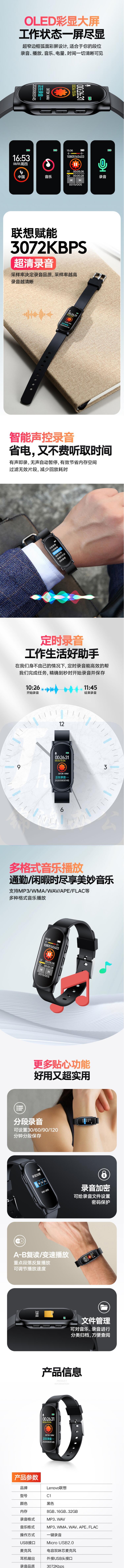 联想 录音笔C1 16GB录音手环 腕式录音器
