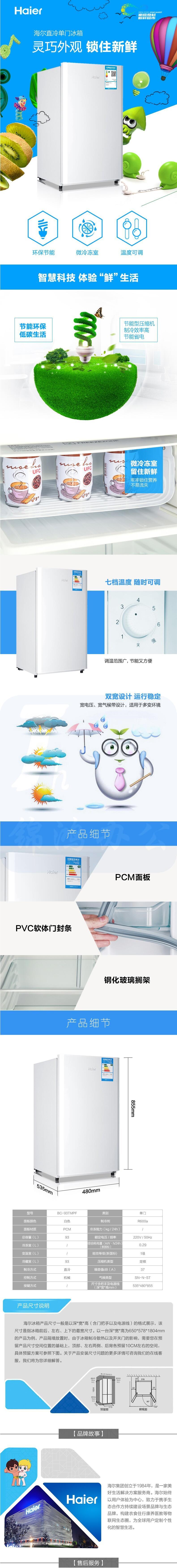 海尔(Haier)93升单门冷藏节能小型电冰箱 一级能效 BC-93TMPF