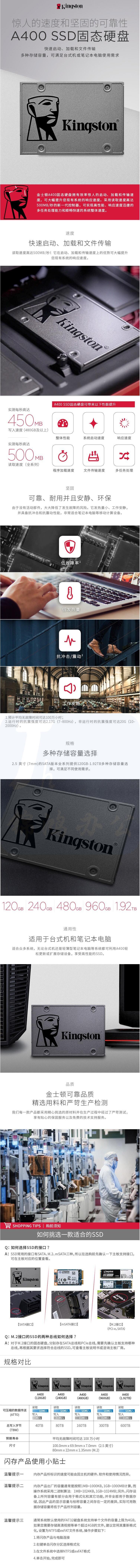 金士顿 480G固态硬盘A400台式机笔记本 SATA固态 SSD