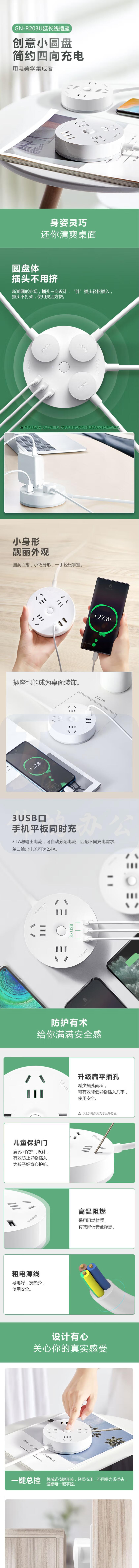 公牛GN-R203U 3usb接口+3孔总控 1.8米 插座/插线板/插排/排插/拖线板 圆形插座