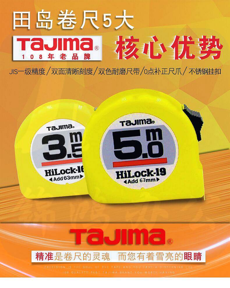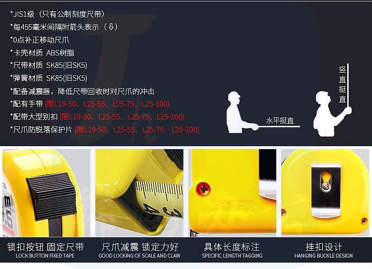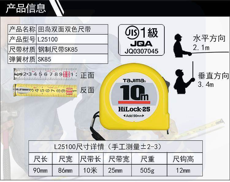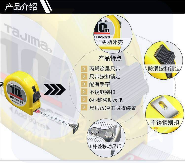品牌:日本田岛; 尺寸:尺带10M*25mm; 材质:尺带进口SK85钢,弹簧进口SK85钢,尺壳ABS树脂,JIS1级,0点补正移动尺爪,手动锁定,配减震器,测量精密,简单,方便,轻巧; 包装规格:6把/盒/60把/箱;