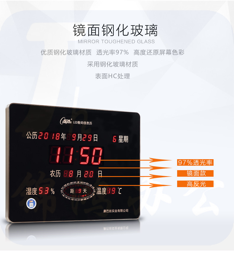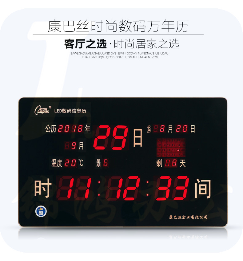 康巴丝 万年历电子挂钟 夜光超薄钟表 95*55温湿度数码 20英寸