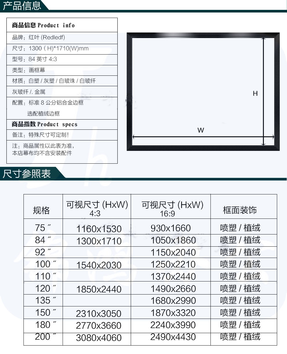 红叶(HONGYE)120寸4:3画框幕高清弹性画框幕灰幕投影幕布 白塑 2.44*1.85