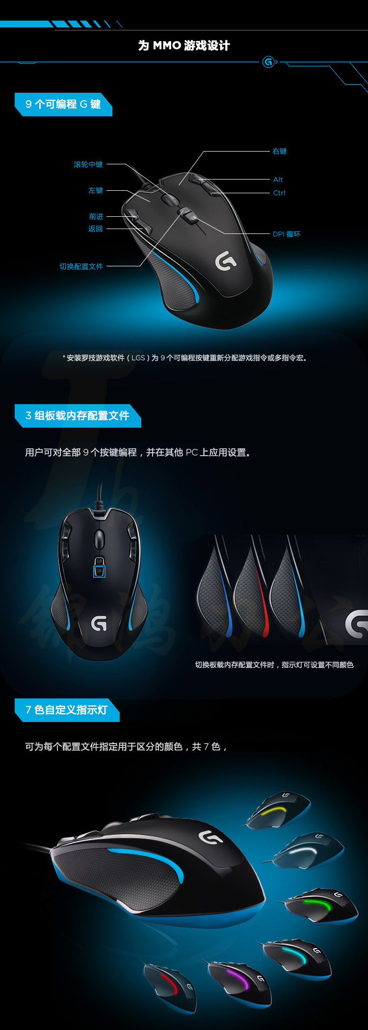 罗技(G)G300s有线鼠标 9个可编程G键