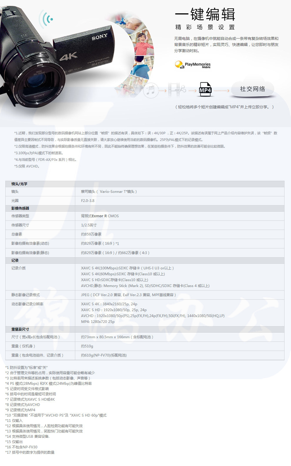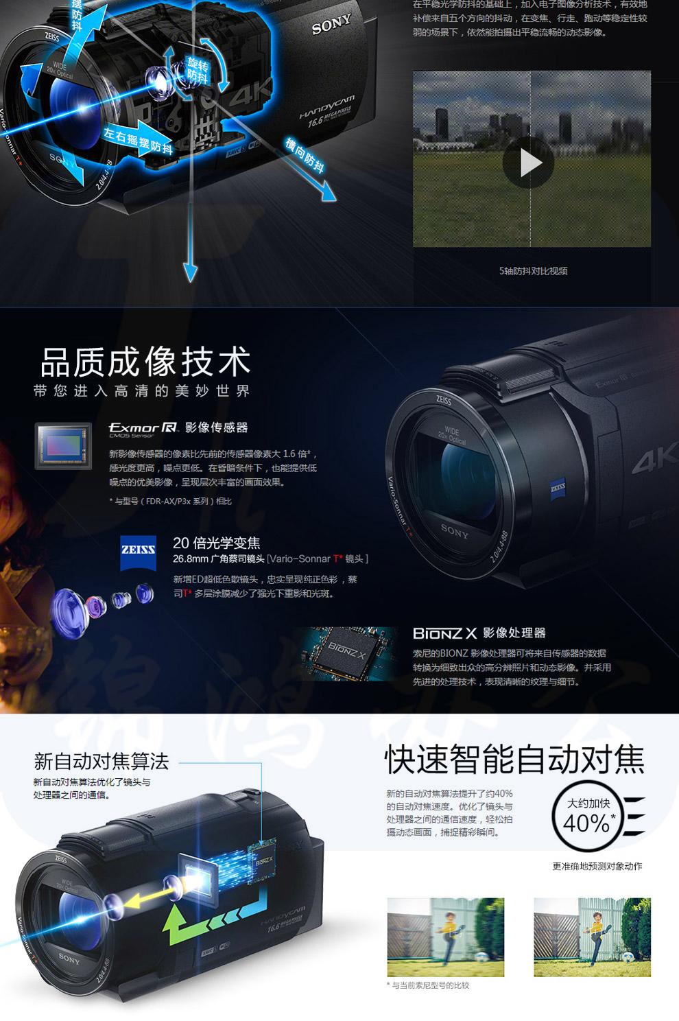 索尼(SONY) FDR-AX40 4K 高清数码摄像机 家用DV机 (内置64G内存) 单机身官方标配