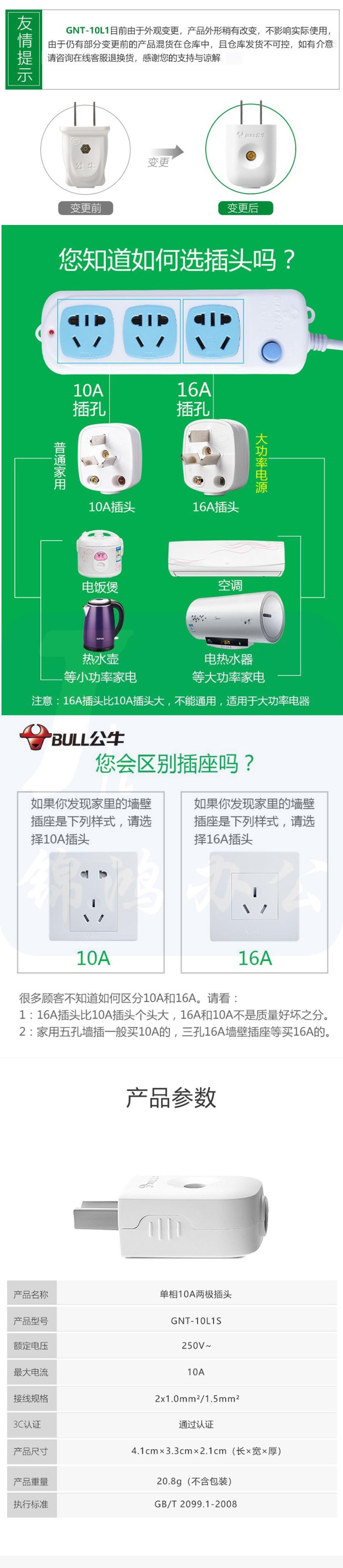 公牛 10A二极插头 二眼插头 GNT-10L1S 二脚插头 220v