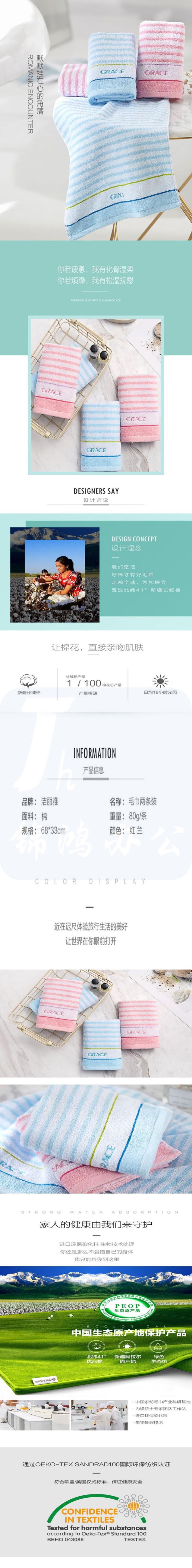 洁丽雅 毛巾 68*33cm纯棉吸水面巾绣花柔软横条纹毛巾 E0067