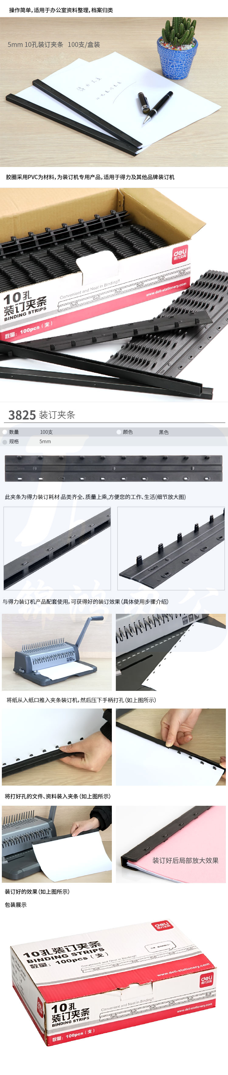 得力3825-10孔装订夹条(黑)300*5mm(100支/盒)