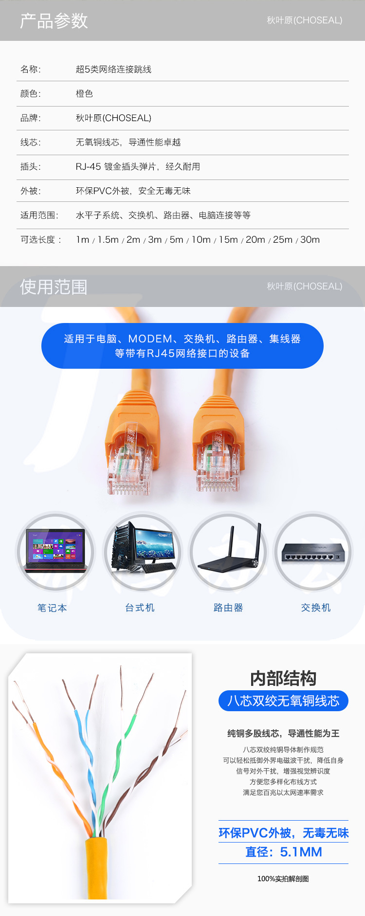 秋叶原(CHOSEAL)高速超五类网线 网络线连接线 带水晶头网络跳线 15米