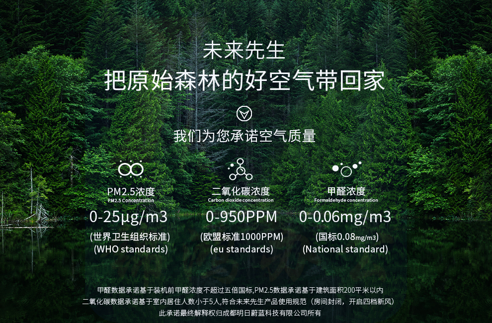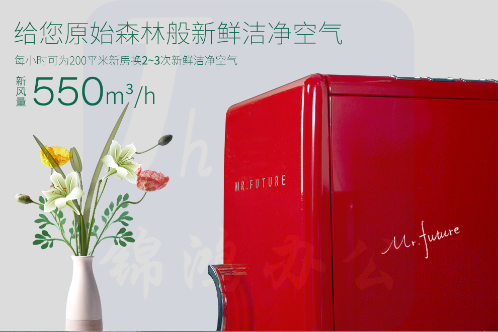 值、550m³/h的新风量,每天为家灌溉1280万升的森林级空气。极速的净化能力,让每台MR.FUTURE®未来先生适用于200平米左右的空间,每12分钟对空间彻底净化一次,顷刻间让房间仿佛置身于森林般的清新中"