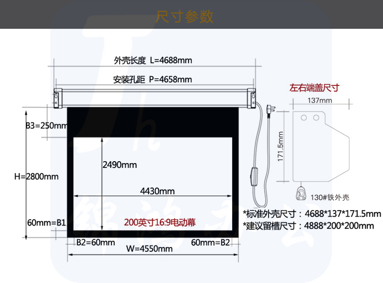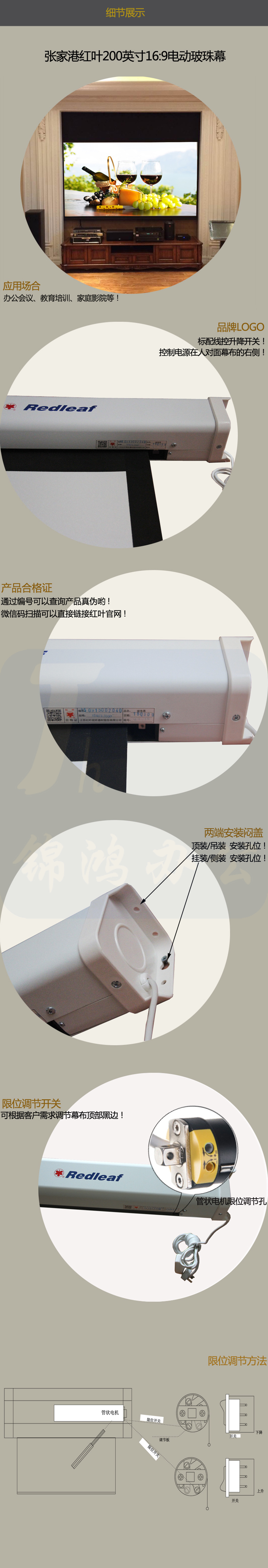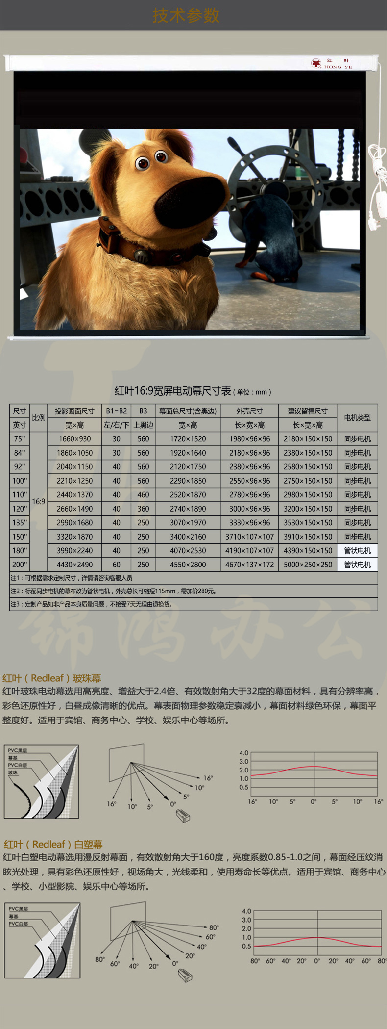 红叶 电动投影幕布200寸16:9白塑幕玻珠幕高清家用幕布 4.43*2.49