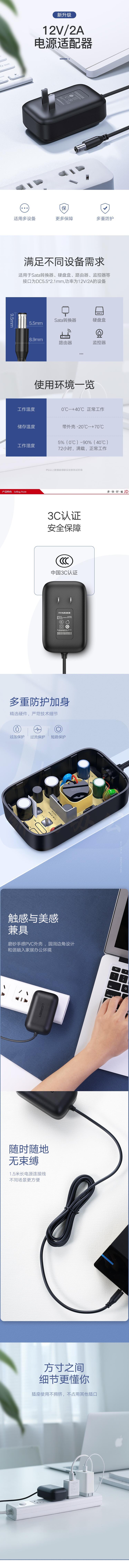 绿联 20359 黑色 12V2A多功能电源适配器充电器