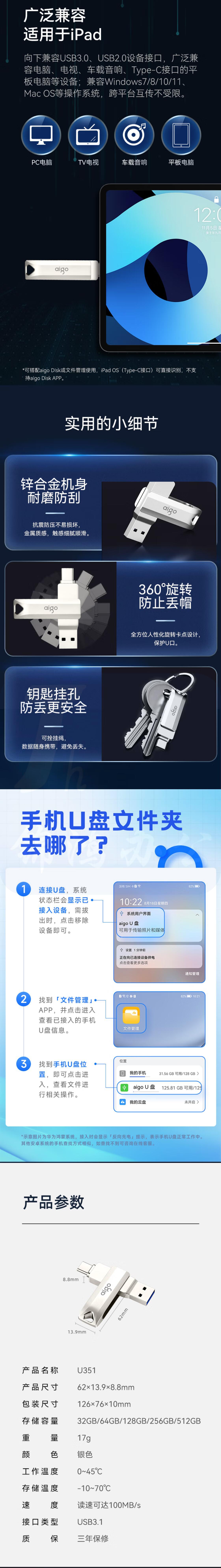 爱国者 32GB Type-C USB3.1 双接口U盘 U351银色手机电脑用
