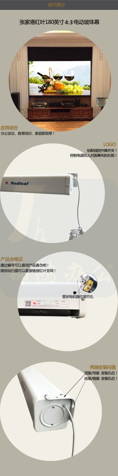 红叶(HONGYE)180英寸4:3电动玻珠白塑银幕 玻珠 3.66*2.77