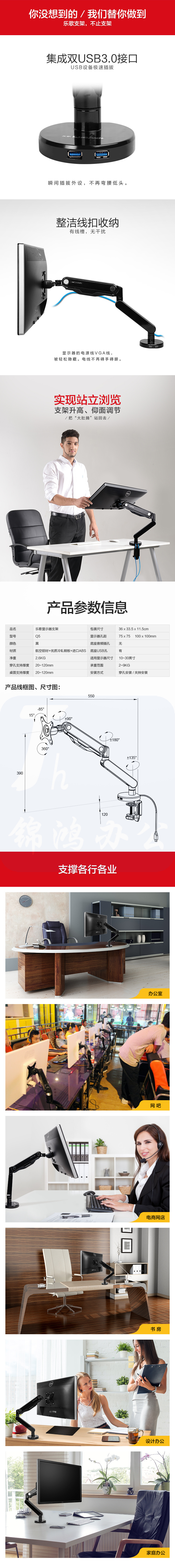 臂长520mm承重2-9KG 适用显示器尺寸10-32寸