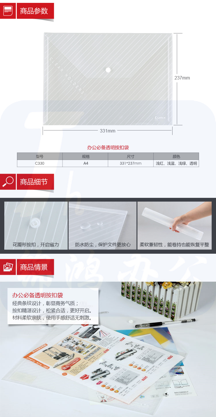 C330 A4 透明按扣文件袋 蓝