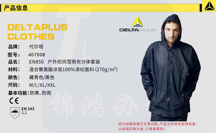 代尔塔 407008 防雨衣 分体式 藏青色 M L XL XXL户外防风套装