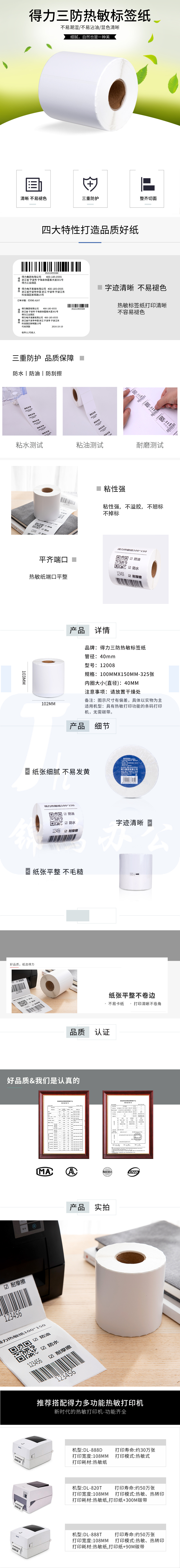 得力 三防热敏打印纸 热敏纸100*150mm-325枚 珊瑚海(1卷/筒)12008