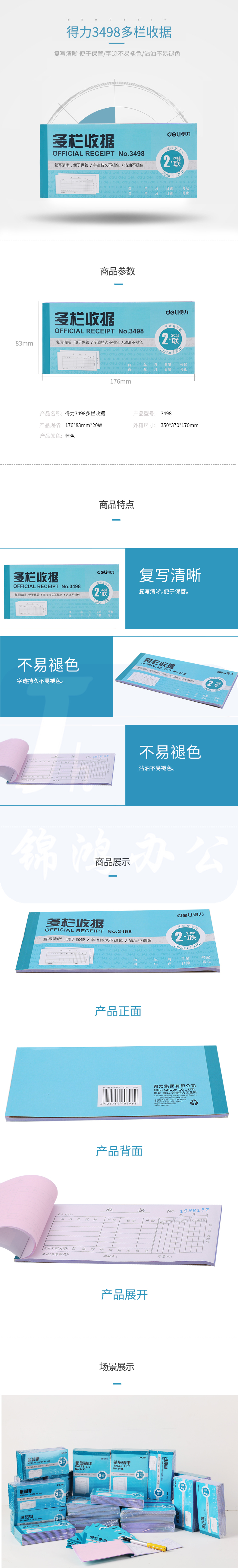 得力 收据 无碳复写二联多栏收据 单据 10本/包 单本价格 3498
