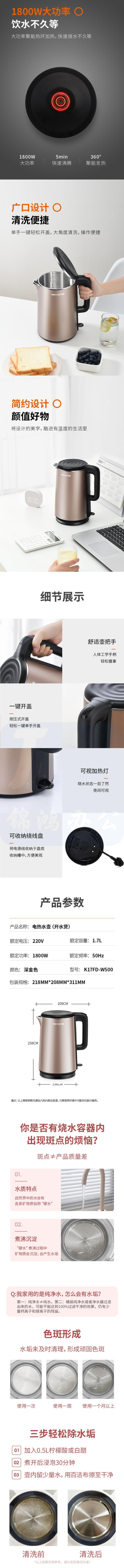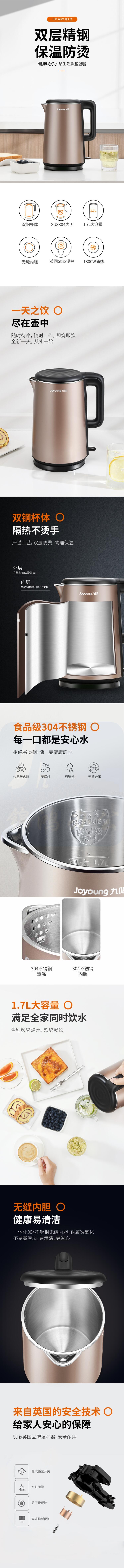 九阳 K17FD-W500 热水壶烧水壶电水壶 1.7L无缝内胆双层锁温防烫电热水壶