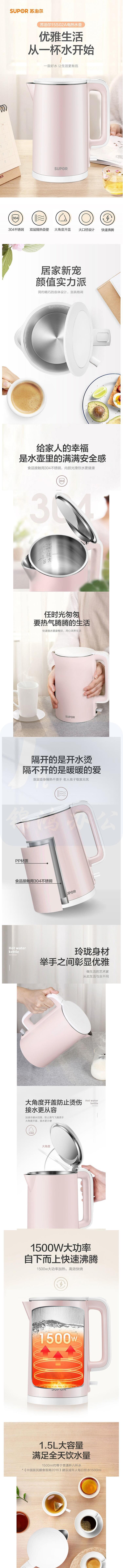 苏泊尔(SUPOR)电热水壶 家用大容量自动烧水壶 食品级不锈钢内胆 双层保温防烫 1.5L SW-15S02A