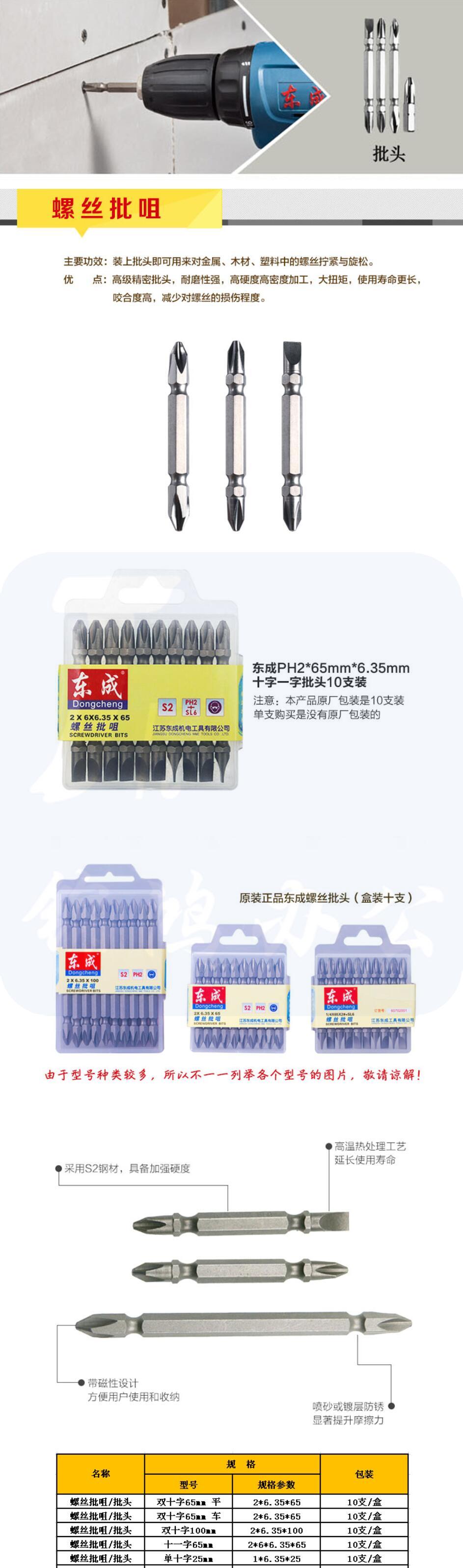 东成 批头65mm螺丝批咀10支装 螺丝批头双头十字批头 2*6.35