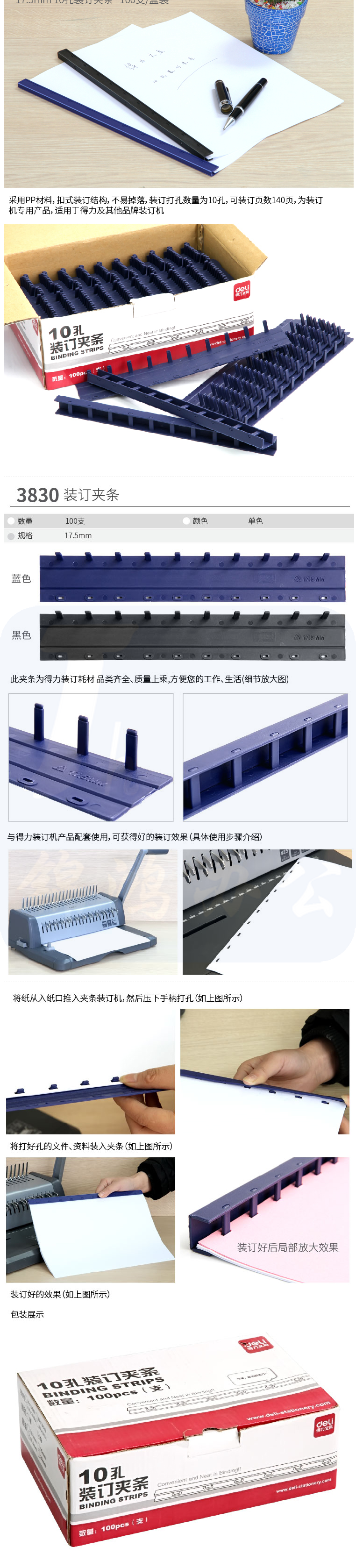得力(deli)3830 黑色 10孔装订夹条 17.5mm 100支/盒