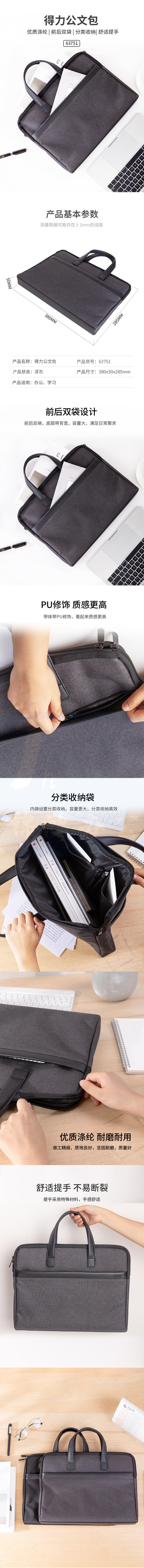 得力63751公文包文件袋14英寸电脑包 380*285*50mm(灰)涤纶+PU
