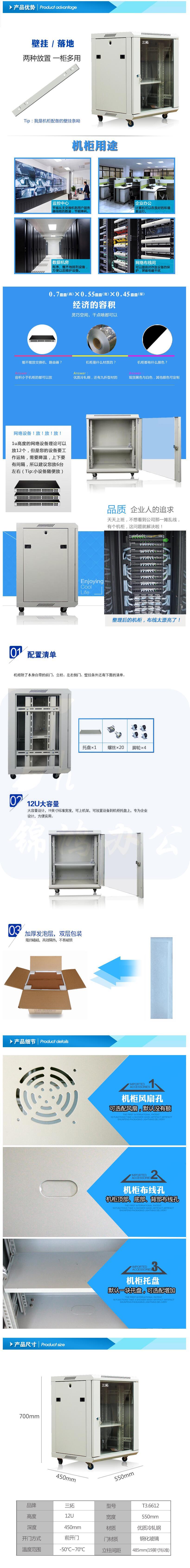 三拓 T3.6612 机柜小型网络12U弱电监控音响落地壁挂交换机小机柜0.7米墙柜